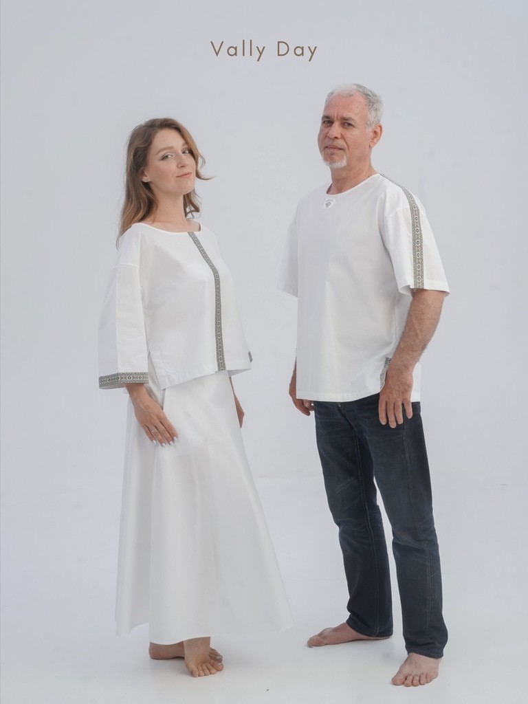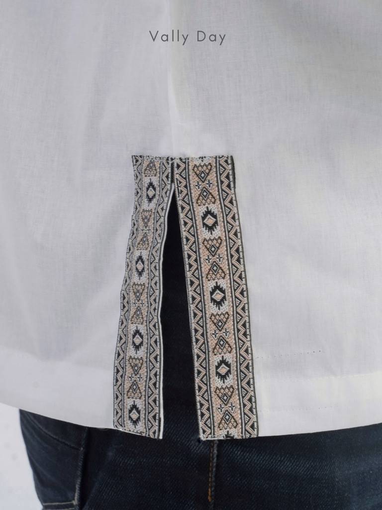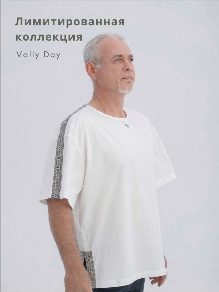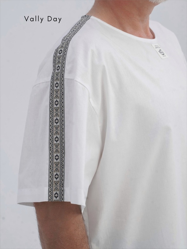 Туника свободного кроя украшена лентой с орнаментом, что придает мужскому образу изюминку традиционного славянского костюма.