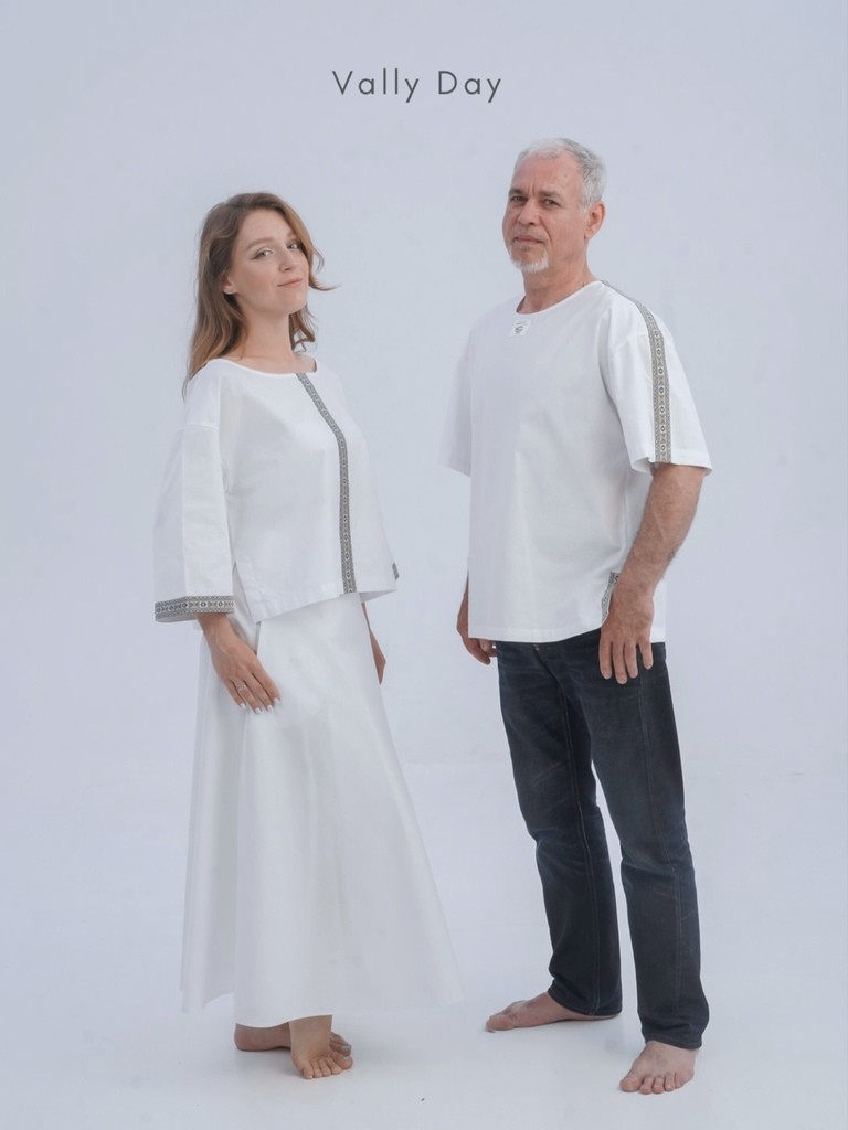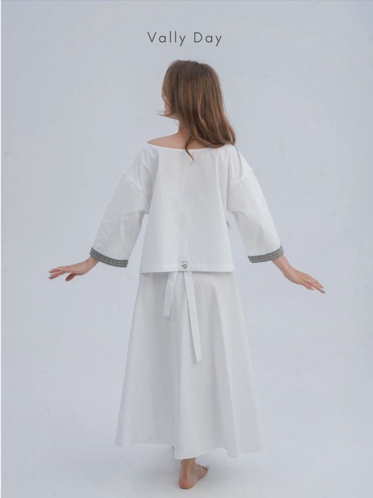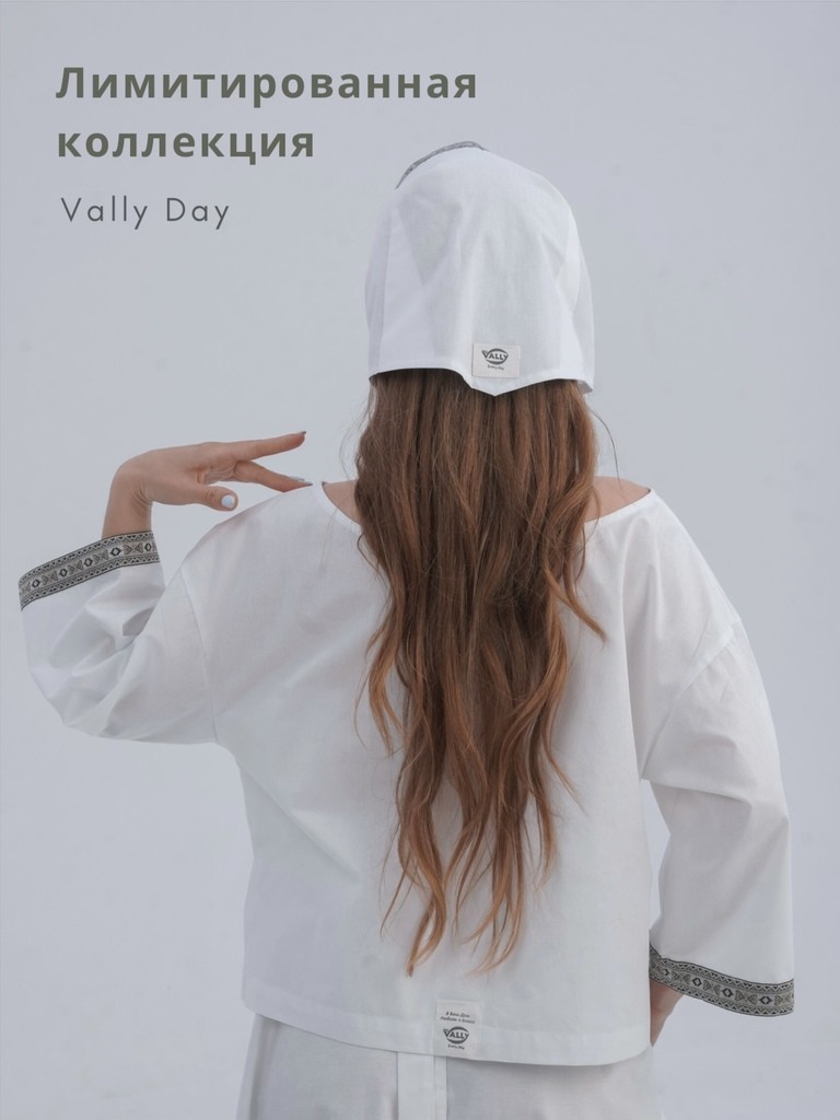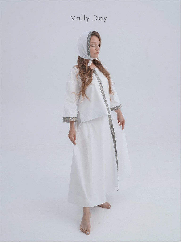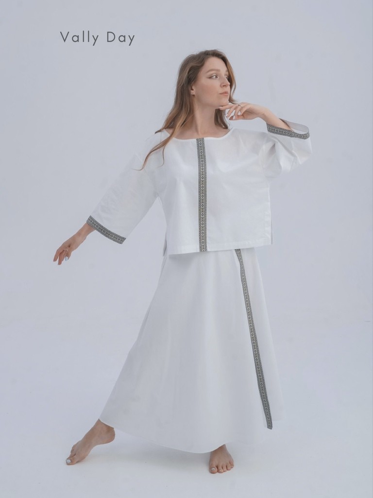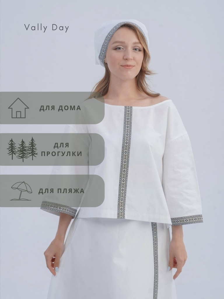 Комплект включает в себя рубаху трапецией, юбку с запахом и косынку. Юбка выполнена так, что сядет на любую фигуру, а разрез пикантно оголит ножку.