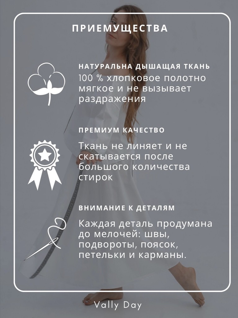 Домашний комплект идеальной жены выполнен из хлопка — сорочечная ткань. Она легкая и мягкая, буквально дышит и отлично впитывает влагу.