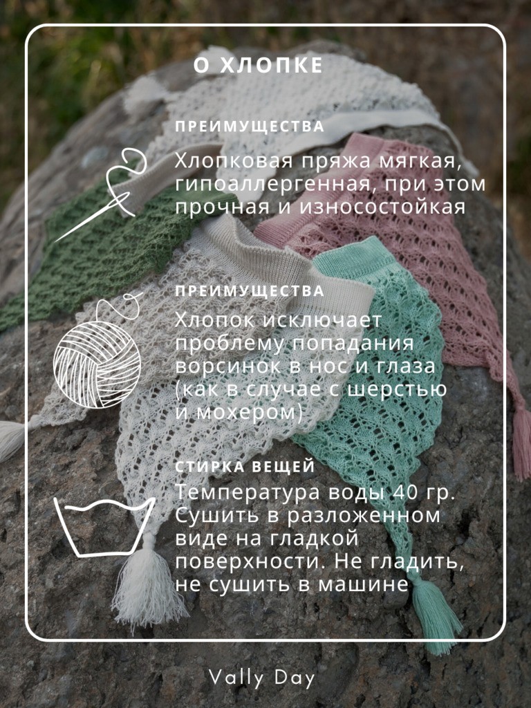 Вязаные хлопковые косынки требуют бережного ухода. Ручная стирка в прохладной воде с мягким моющим средством, избегая сильного трения и выкручивания, является лучшим способом стирки. Сушить косынку нужно в горизонтальном положении, избегая прямых солнечных лучей и высоких температур.